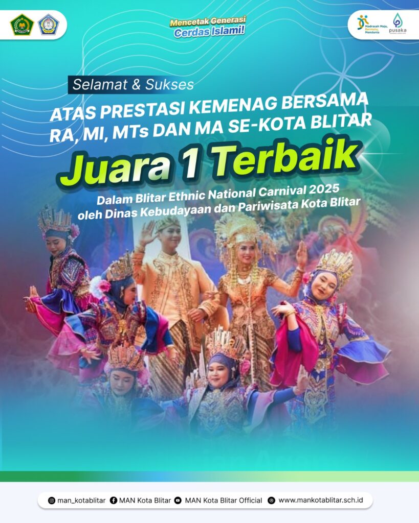 Bangga! Madrasah di bawah naungan Kemenag Se-Kota Blitar berhasil membawa pulang gelar Juara 1 Terbaik di Blitar Ethnic National Carnival 2025. Prestasi ini bukan hanya tentang piala, melainkan tentang semangat kebersamaan, kreativitas, dan komitmen untuk melestarikan kekayaan budaya Indonesia. Teruslah berkarya dan menginspirasi, generasi muda Blitar!